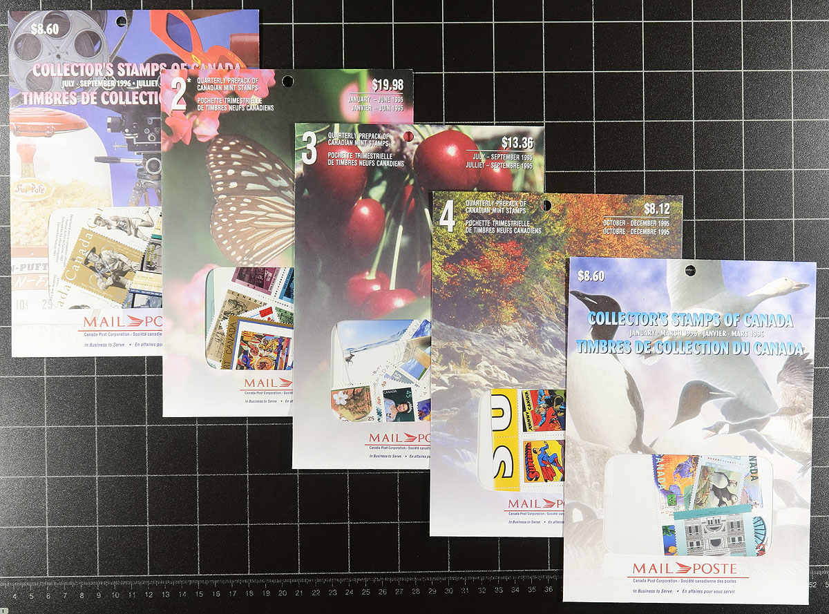 Quarterly Packs. Pristine lot of Quarterly Packs complete for the years 1995-1999 inclusive (19 packs, 1995 only had 3 packs issue, Jan-Jun, July-Sept, Oct-Dec), sealed and with all of the issues for the period, as well as se-tenant blocks and souvenir sheets. These are now listed in Unitrade but not yet priced, conservatively grouped / counted by the original purchase price. Many of these packs sold originally for less than $10.00 and are usually offered at large premium online. Original Canada Post cost =