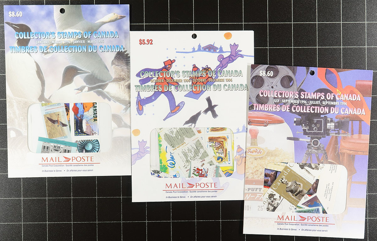 Quarterly Pack Potpourri. An "odds and ends" offering of 23 Post Office sealed Quarterly Packs / Bi-Annual Packs. Includes 1992 (complete, in two Bi-Annual packs), 1993 (Q2, Q3), 1995 (Q1+Q2 combo, Q3, Q4 - two complete sets), 1996 (Q1, Q2 x2, Q3, Q4), 1999 (Q3, Q4), 2001 (Q3, Q4), 2002 (Q1, Q2, Q3), 2016 (Q1), 2017 (Q4). Includes many sought-after die cut singles as well as blocks and souvenir sheets. These are now listed in Unitrade but not yet priced, conservatively grouped / counted by the original purchase price, which is lower than what is actually enclosed in the pack due to the increase in value of the Permanent stamps. Original Canada Post cost =