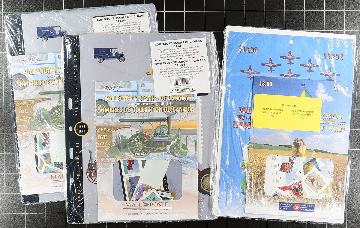 Quarterly Pack Potpourri. An "odds and ends" offering of 23 Post Office sealed Quarterly Packs / Bi-Annual Packs. Includes 1992 (complete, in two Bi-Annual packs), 1993 (Q2, Q3), 1995 (Q1+Q2 combo, Q3, Q4 - two complete sets), 1996 (Q1, Q2 x2, Q3, Q4), 1999 (Q3, Q4), 2001 (Q3, Q4), 2002 (Q1, Q2, Q3), 2016 (Q1), 2017 (Q4). Includes many sought-after die cut singles as well as blocks and souvenir sheets. These are now listed in Unitrade but not yet priced, conservatively grouped / counted by the original purchase price, which is lower than what is actually enclosed in the pack due to the increase in value of the Permanent stamps. Original Canada Post cost =