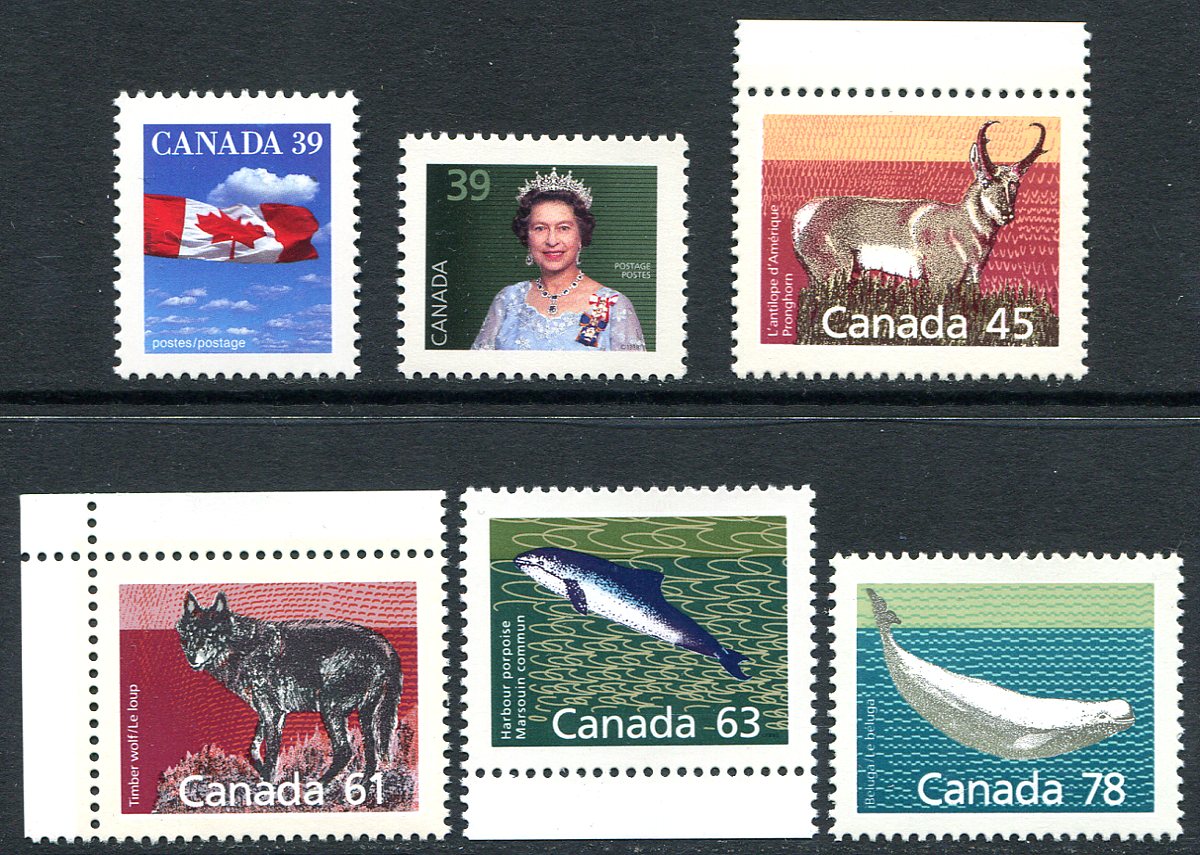 VF mint Never Hinged group of six different 1989-1990 QEII / "Flag Over" / Mammal issue perf-change, sub-listings in Unitrade. These issues can be a challenge to find, and often best found when you have a correctly identified example to compare them against. 2025-2026 Unitrade =