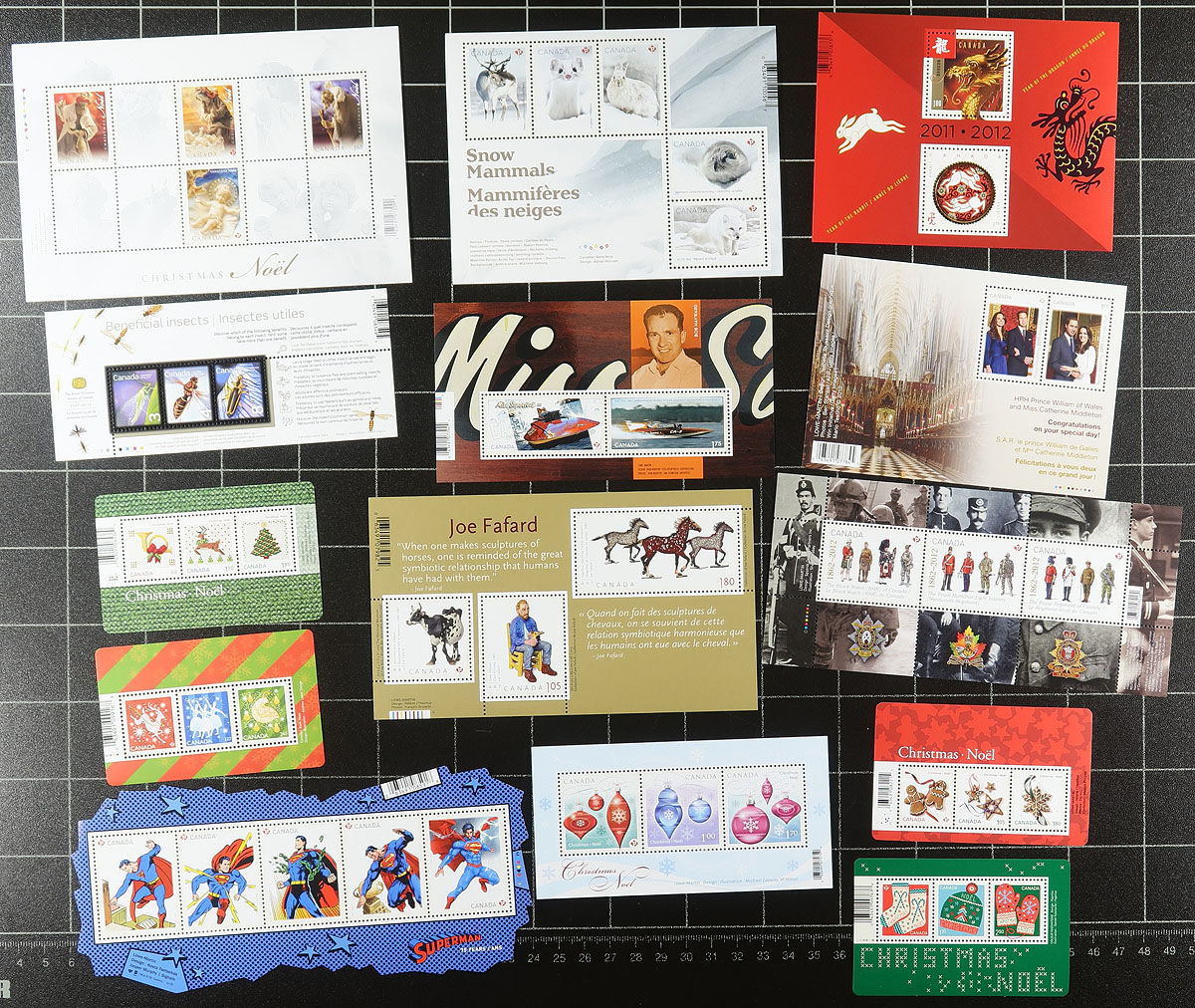 Modern Souvenir Sheets Part A. An attractive holding of all-different modern souvenir sheets, including many "P" value stamps / mixed $1.00 PLUS values. A total of 40 sheets, including Superman, 2010 Olympics, Snow Mammals, Roadside Attractions, Joe Fafard etc. Conservatively value for the total face value alone (catalogue value would be at least double). Total face value =