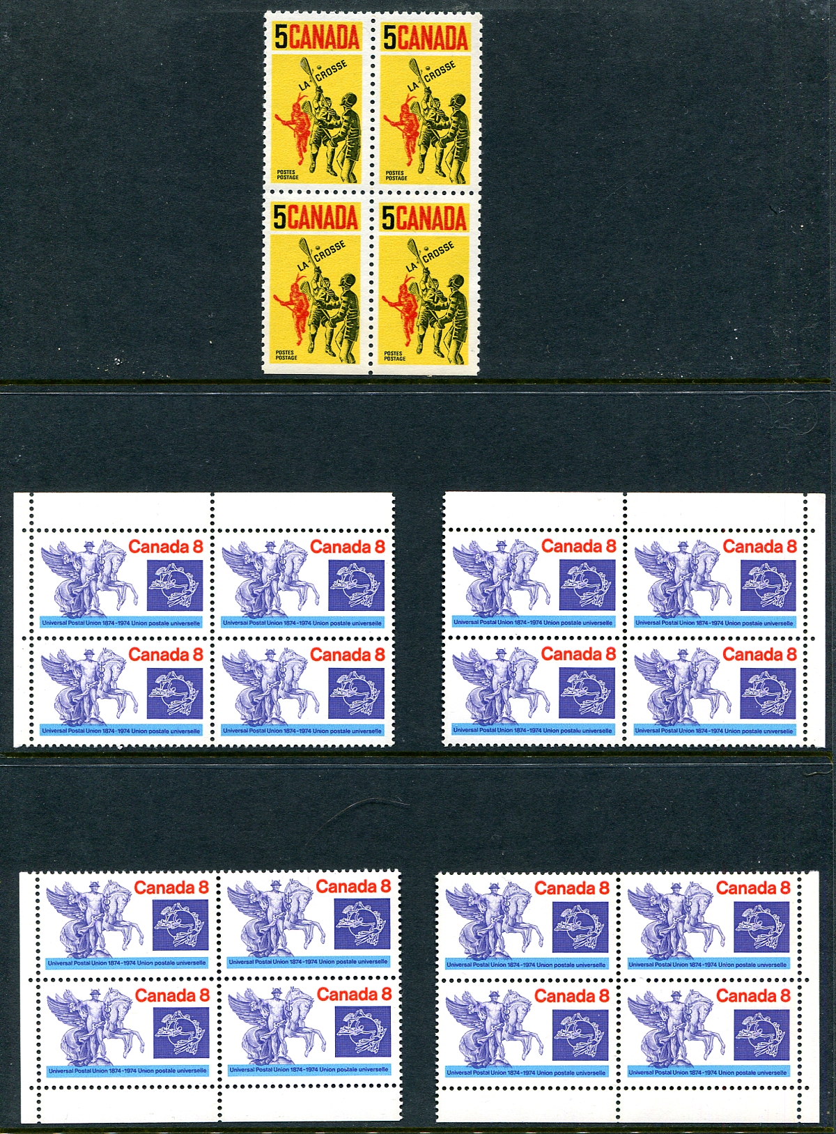 VF mint Never Hinged group "Kiss" or "Ghost" printing errors, both Unitrade listed varieties including the 1968 Lacrosse issue in block of four with "kiss print" doubling of red, plus the 1974 UPU issue 8c value, with ghost print "Canada 8" doubling in a matched set of corner blocks with additional "red streak" (#648i) on top right stamp of LL block. 2025-2026 Unitrade =