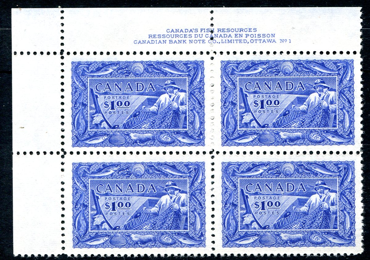 Post Office fresh mint Never Hinged lower upper-left #1 plate block of four of the 1951 issue $1.00 "Fisheries". This is the last GeoVI high value issued and the first GeoVI $1.00 value that most collectors acquire. 2025-2026 Unitrade =