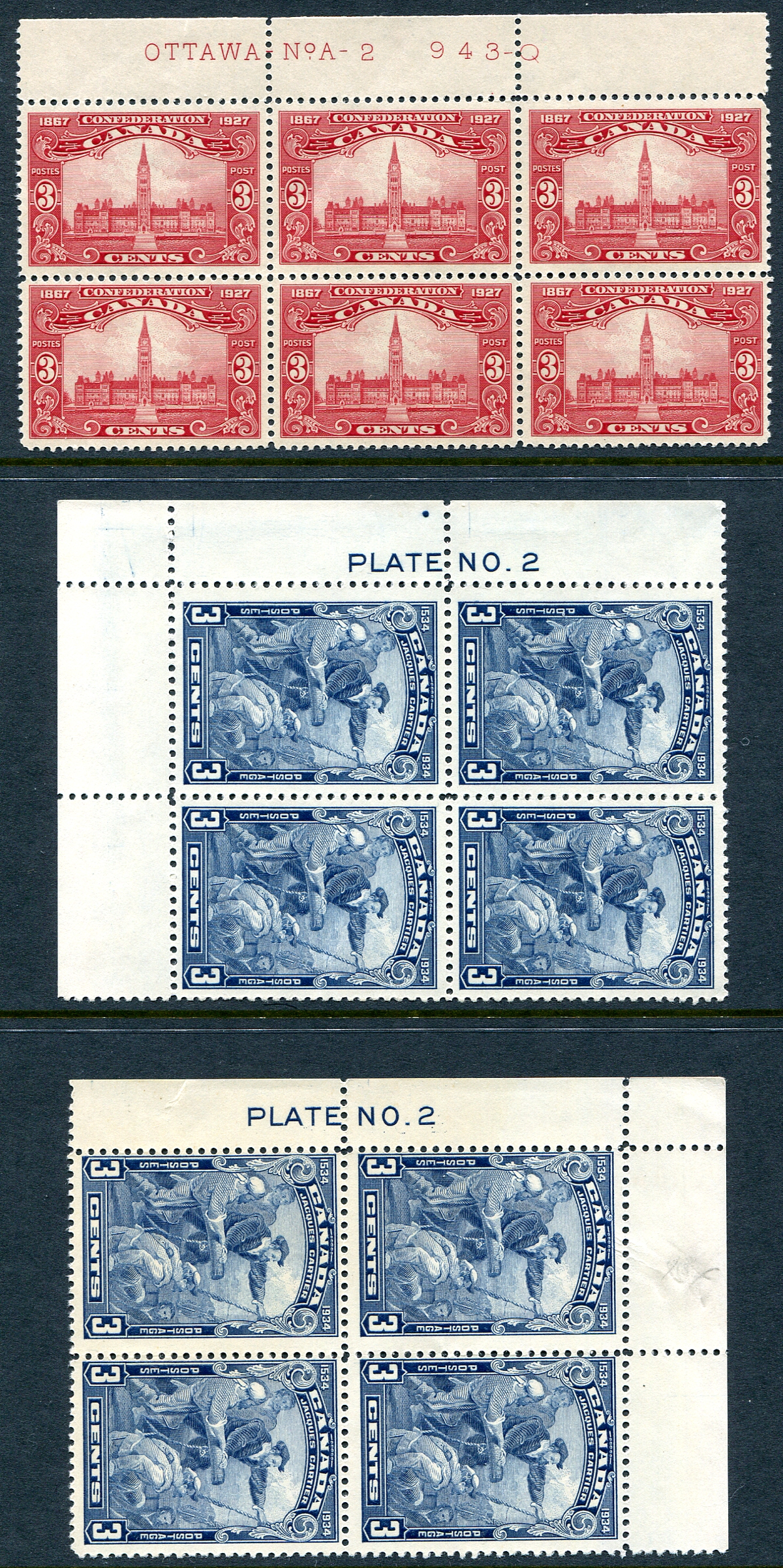 Attractive trio of early Plate Blocks, starting with the 1927 Confederation 3c value, with full "Ottaw No.A-2" inscription in VF mint Never Hinged block of six. This is followed by a duo of 1934 Jacques Cartier, LL and UL inscription (Plate No.2) blocks of four, both with stamps NH, but hinged in selvedge (one Fine, one VF). 2025-2026 Unitrade =