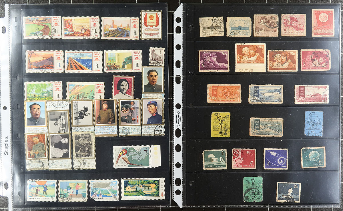 Enticing old-time holding of mint and used PRC as assembled by a collector and arranged on stocksheets, original dealer envelopes and in glassines. Over 375 stamps in total, including many sets, singles, souvenir sheets (noted on HK as well), FDC etc. The best of the group is two mint NH sets #1271-1274 (cat US$50.00) and #1618-1625 (cat US$57.00), but the group is loaded with lots of seldom seen used issues from the 1956-1985 period. Expect some faults, as often found with the used stamps of this period. Estimate =