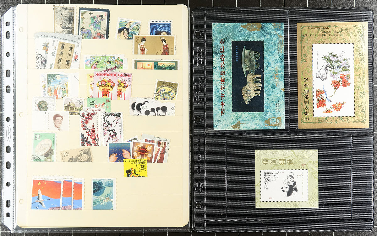 Enticing old-time holding of mint and used PRC as assembled by a collector and arranged on stocksheets, original dealer envelopes and in glassines. Over 375 stamps in total, including many sets, singles, souvenir sheets (noted on HK as well), FDC etc. The best of the group is two mint NH sets #1271-1274 (cat US$50.00) and #1618-1625 (cat US$57.00), but the group is loaded with lots of seldom seen used issues from the 1956-1985 period. Expect some faults, as often found with the used stamps of this period. Estimate =