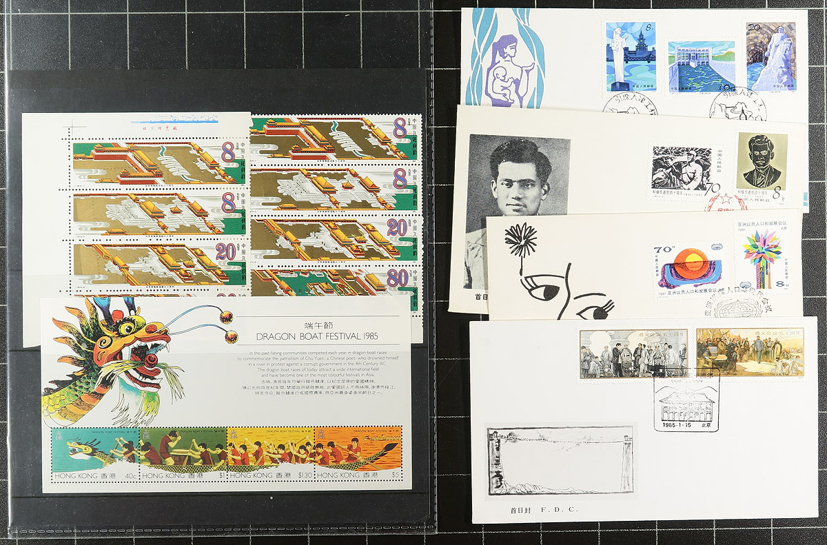 Enticing old-time holding of mint and used PRC as assembled by a collector and arranged on stocksheets, original dealer envelopes and in glassines. Over 375 stamps in total, including many sets, singles, souvenir sheets (noted on HK as well), FDC etc. The best of the group is two mint NH sets #1271-1274 (cat US$50.00) and #1618-1625 (cat US$57.00), but the group is loaded with lots of seldom seen used issues from the 1956-1985 period. Expect some faults, as often found with the used stamps of this period. Estimate =