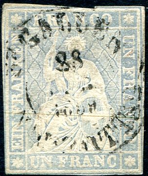 VG used example of the 1855-1857 issue 1fr lavender imperforate with yellow silk thread. Used with attractive "socked on the nose" postmark, clear margins on three sides, cut into at top. 2025 Scott US$1,000.00 =
