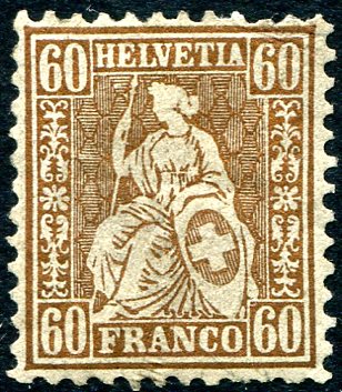 Fine mint part original gum Hinged example of the seldom seen mint 1862 issued 60c bronze Helvetia issue. Perf faults at UL corner, but a rare stamp. 2025 Scott US$1550.00 =