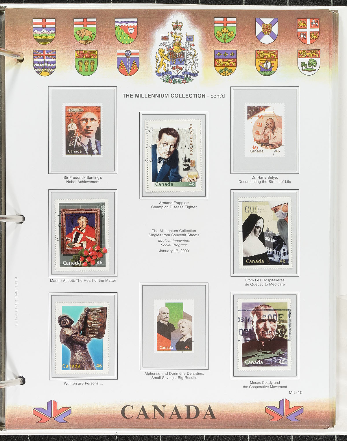 Collection of used Canada, 1897-2002, containing many hundreds of stamps in two binders containing Unity album pages. The collection ranges from Scott #66/1967, somewhat sparsely filled throughout but did note partial sets of Leafs, Numerals, complete set of Edwards, along with several coil pairs, with better completeness from the 1970's onwards (including a few souvenir sheets), with singles and sets cataloguing from $5 to $10 each. A good start and should be continued until completion, overall fine to very fine. Estimate =
