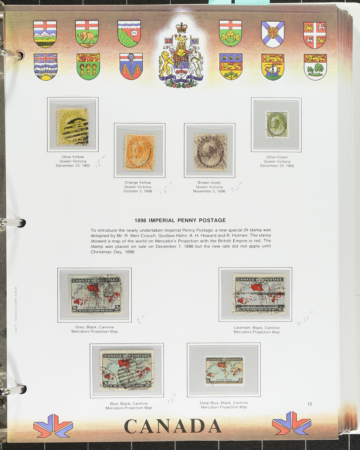 Collection of used Canada, 1897-2002, containing many hundreds of stamps in two binders containing Unity album pages. The collection ranges from Scott #66/1967, somewhat sparsely filled throughout but did note partial sets of Leafs, Numerals, complete set of Edwards, along with several coil pairs, with better completeness from the 1970's onwards (including a few souvenir sheets), with singles and sets cataloguing from $5 to $10 each. A good start and should be continued until completion, overall fine to very fine. Estimate =