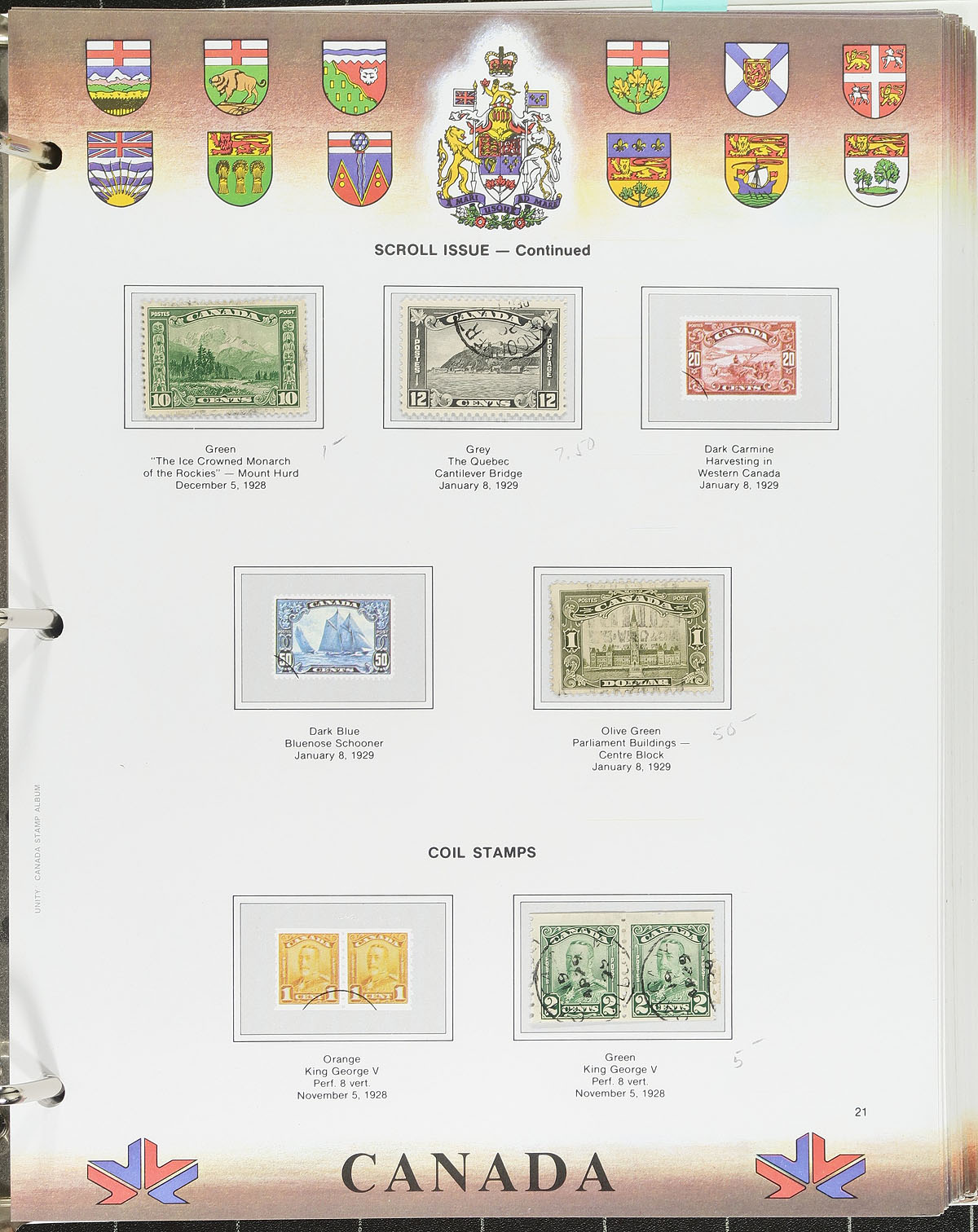 Collection of used Canada, 1897-2002, containing many hundreds of stamps in two binders containing Unity album pages. The collection ranges from Scott #66/1967, somewhat sparsely filled throughout but did note partial sets of Leafs, Numerals, complete set of Edwards, along with several coil pairs, with better completeness from the 1970's onwards (including a few souvenir sheets), with singles and sets cataloguing from $5 to $10 each. A good start and should be continued until completion, overall fine to very fine. Estimate =