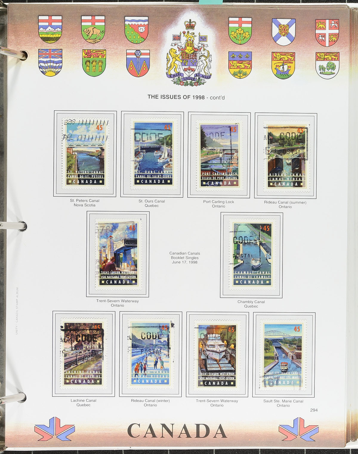 Collection of used Canada, 1897-2002, containing many hundreds of stamps in two binders containing Unity album pages. The collection ranges from Scott #66/1967, somewhat sparsely filled throughout but did note partial sets of Leafs, Numerals, complete set of Edwards, along with several coil pairs, with better completeness from the 1970's onwards (including a few souvenir sheets), with singles and sets cataloguing from $5 to $10 each. A good start and should be continued until completion, overall fine to very fine. Estimate =