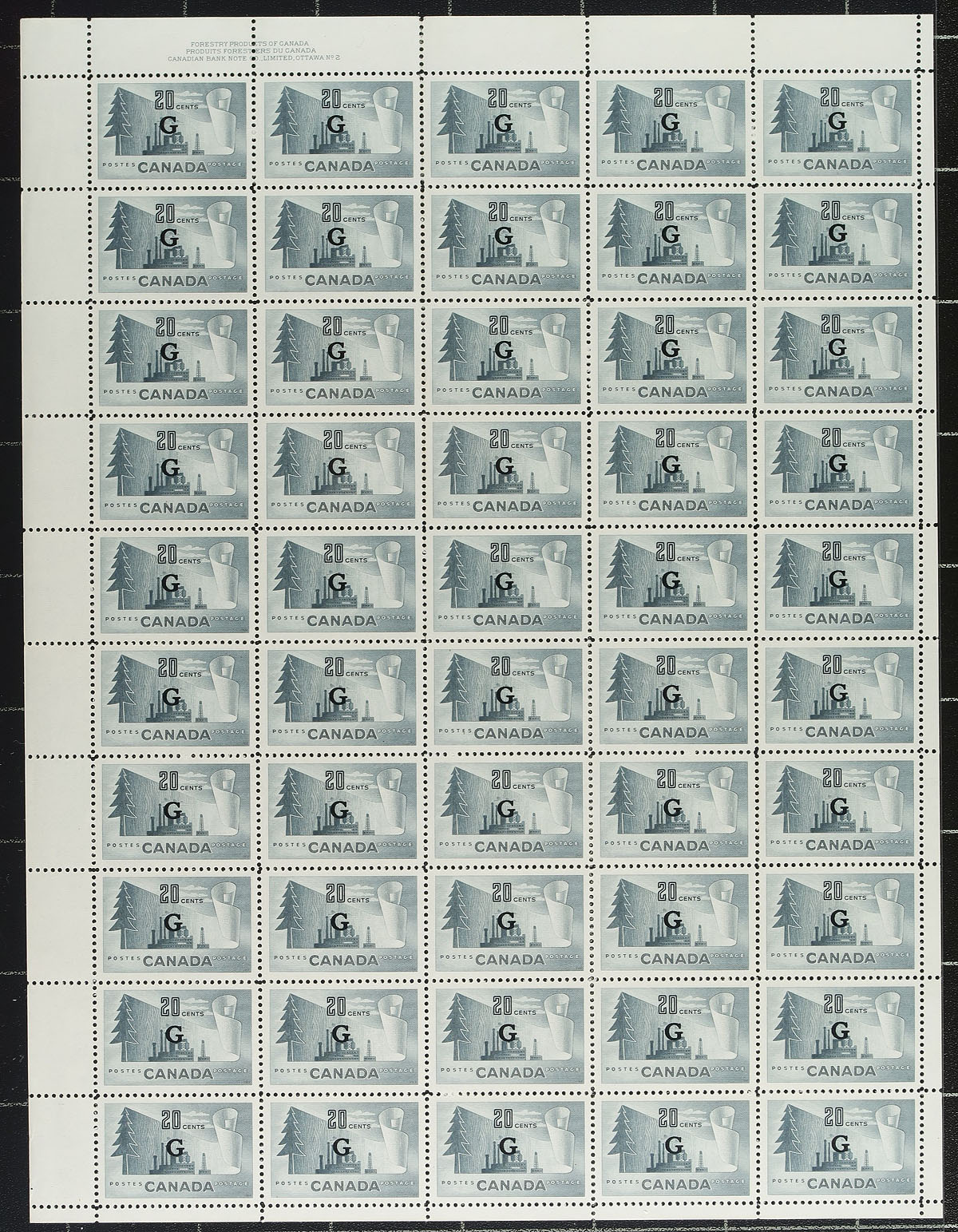 Quartet of mint Never Hinged complete sheets of 50 stamps of the "G" overprint Official for the 20c Forestry, 10c Inuit Kayak, 7c Canada Goose and 20c Paper Industry issues. All with plate inscriptions at one corner (as these came from large prints of 200 stamps, broken into 4 sheets with one inscription per sheet). A lovely group, Post Office fresh. 2025-2026 Unitrade =