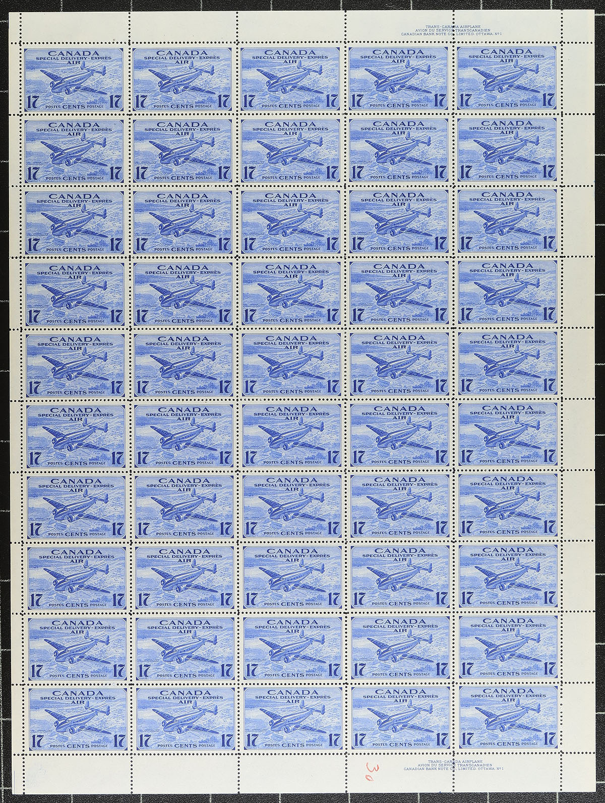 VF mint NH complete sheet of 50 of the 1943 issue 17c bright ultramarine "Trans-Canada airplane" Airmail Special Delivery issue. The sheet includes inscription blocks at the upper right and lower right corners, folded between rows 3 / 4 with two stamps having separation along the fold and small crayon marking in lower right selvedge. 2025-2026 Unitrade =
