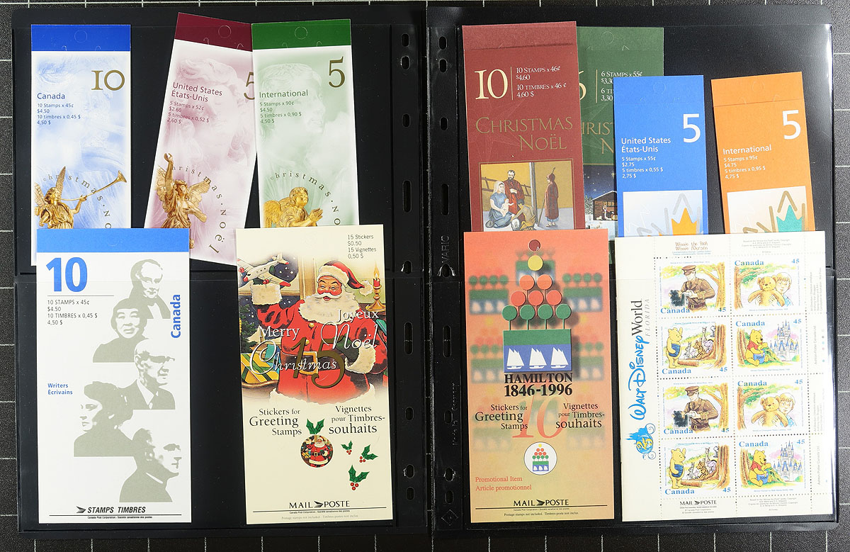 Mint Complete Booklet Holding. A very clean late 1990's / early 2000's collection of complete booklets, including many better such as USA / International rates, greetings stamps, defintives etc. All housed on Vario brand pages, within a deluxe Minkus padded 3-ring Canada binder. Some minor duplication, but not checked for any better fluorescent paper types that occur on some of these issues. Valued only for the total usable postage. Total face value =