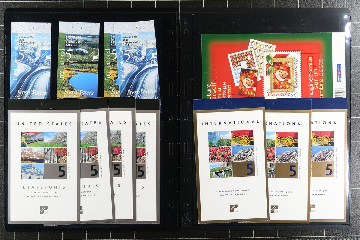 Mint Complete Booklet Holding. A very clean late 1990's / early 2000's collection of complete booklets, including many better such as USA / International rates, greetings stamps, defintives etc. All housed on Vario brand pages, within a deluxe Minkus padded 3-ring Canada binder. Some minor duplication, but not checked for any better fluorescent paper types that occur on some of these issues. Valued only for the total usable postage. Total face value =