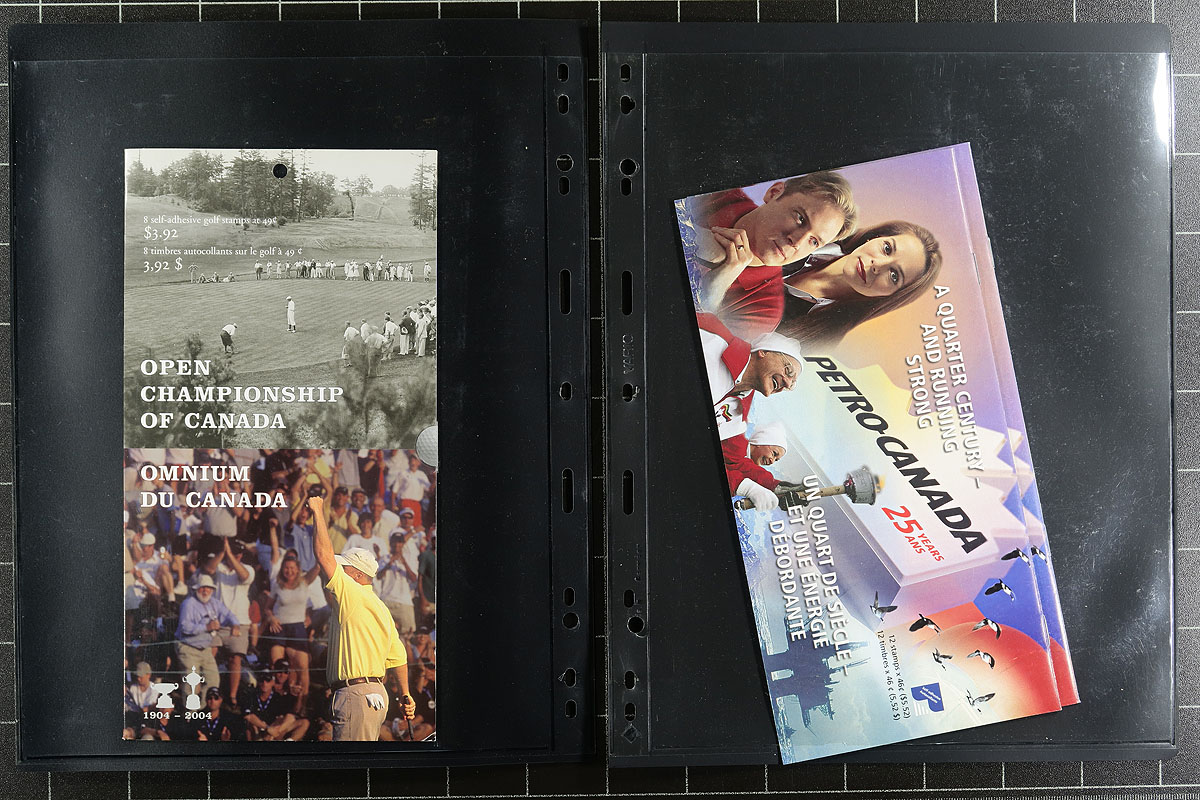 Mint Complete Booklet Holding. A very clean late 1990's / early 2000's collection of complete booklets, including many better such as USA / International rates, greetings stamps, defintives etc. All housed on Vario brand pages, within a deluxe Minkus padded 3-ring Canada binder. Some minor duplication, but not checked for any better fluorescent paper types that occur on some of these issues. Valued only for the total usable postage. Total face value =