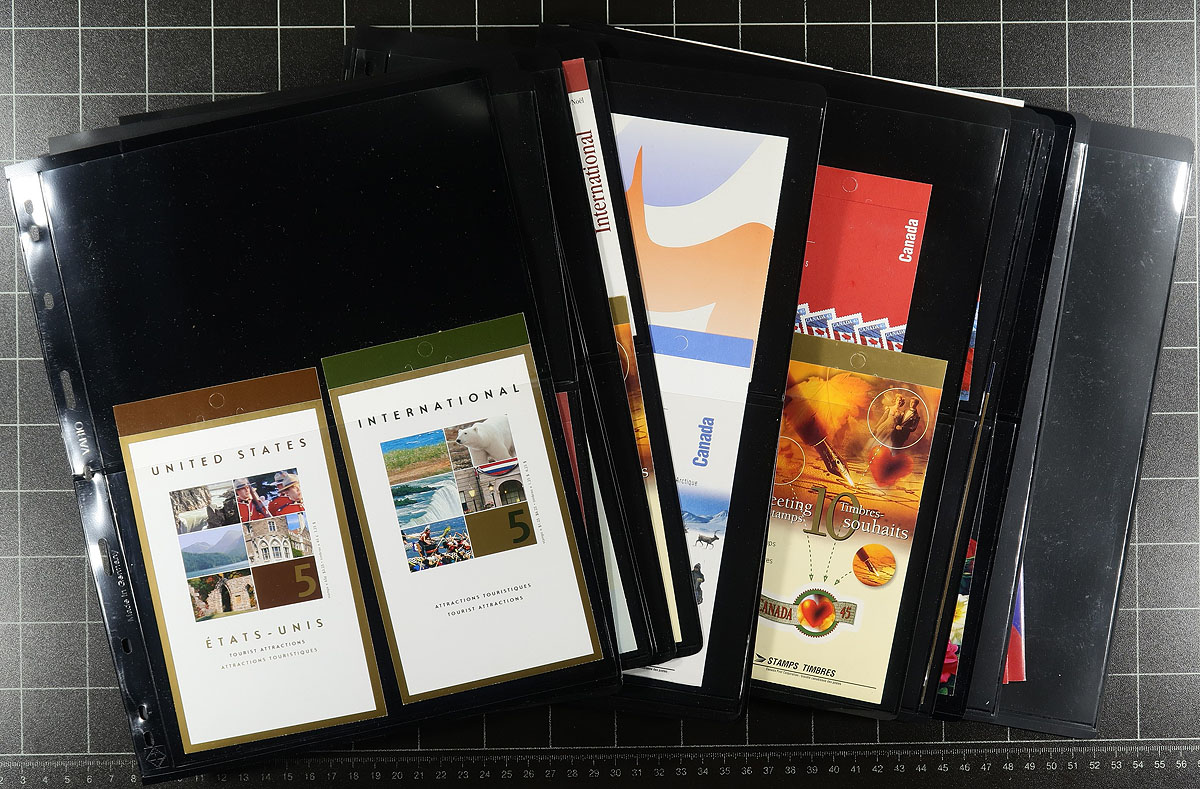 Mint Complete Booklet Holding. A very clean late 1990's / early 2000's collection of complete booklets, including many better such as USA / International rates, greetings stamps, defintives etc. All housed on Vario brand pages, within a deluxe Minkus padded 3-ring Canada binder. Some minor duplication, but not checked for any better fluorescent paper types that occur on some of these issues. Valued only for the total usable postage. Total face value =