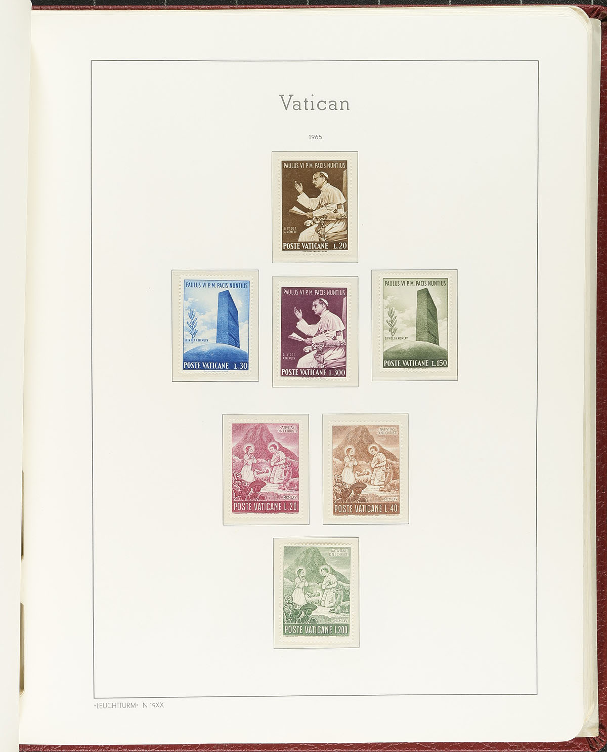 Attractive old-style Lighthouse hingeless album, with pages from the beginning (1929) up to 1983. While the mint stamps are a bit sparse in beginning section, sets start to appear during the WWII period, with 1954-1983 being largely complete. A spot check showed mostly Never Hinged, especially in the latter portion. A nice chance to get a solid "foot in the door" mint collection, in a premium album. Estimate =