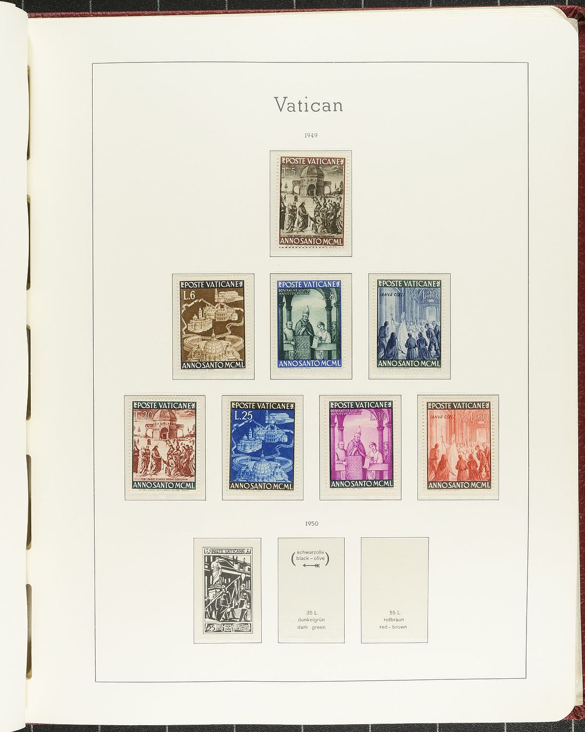 Attractive old-style Lighthouse hingeless album, with pages from the beginning (1929) up to 1983. While the mint stamps are a bit sparse in beginning section, sets start to appear during the WWII period, with 1954-1983 being largely complete. A spot check showed mostly Never Hinged, especially in the latter portion. A nice chance to get a solid "foot in the door" mint collection, in a premium album. Estimate =