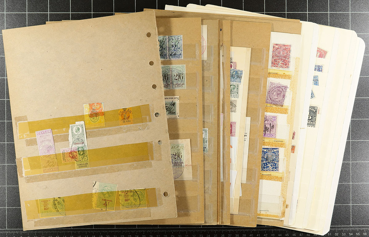 A small 3-ring binder, containing a wide-ride of old-time stockpages with Revenue / Fiscal stamps from Great Britain, Italy, Austria, Ceylon, Denmark, Norway, India, USA, Isreal, France and Canada (and many more). A very intriguing holding, that should prove rewarding once sorted out. Of particular note is the British Consular stamps, which were used on documents on countries around the world (we noted markings from Mexico and Siam, just to name a couple). Estimate =