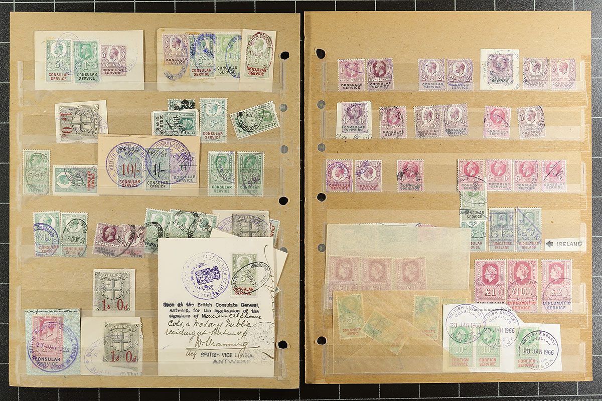 A small 3-ring binder, containing a wide-ride of old-time stockpages with Revenue / Fiscal stamps from Great Britain, Italy, Austria, Ceylon, Denmark, Norway, India, USA, Isreal, France and Canada (and many more). A very intriguing holding, that should prove rewarding once sorted out. Of particular note is the British Consular stamps, which were used on documents on countries around the world (we noted markings from Mexico and Siam, just to name a couple). Estimate =