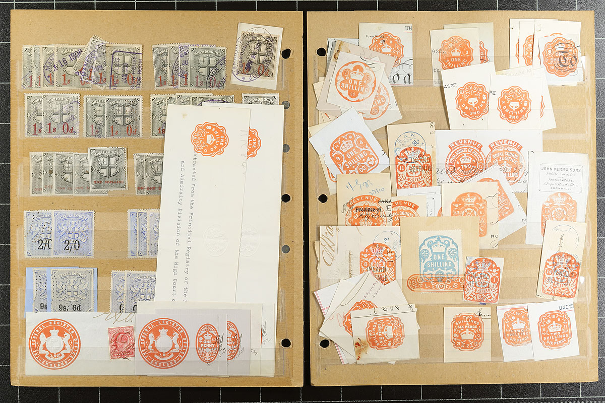 A small 3-ring binder, containing a wide-ride of old-time stockpages with Revenue / Fiscal stamps from Great Britain, Italy, Austria, Ceylon, Denmark, Norway, India, USA, Isreal, France and Canada (and many more). A very intriguing holding, that should prove rewarding once sorted out. Of particular note is the British Consular stamps, which were used on documents on countries around the world (we noted markings from Mexico and Siam, just to name a couple). Estimate =