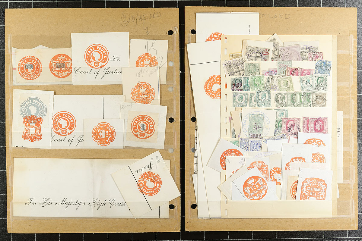 A small 3-ring binder, containing a wide-ride of old-time stockpages with Revenue / Fiscal stamps from Great Britain, Italy, Austria, Ceylon, Denmark, Norway, India, USA, Isreal, France and Canada (and many more). A very intriguing holding, that should prove rewarding once sorted out. Of particular note is the British Consular stamps, which were used on documents on countries around the world (we noted markings from Mexico and Siam, just to name a couple). Estimate =