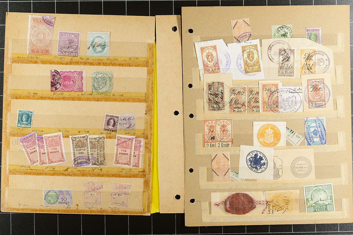 A small 3-ring binder, containing a wide-ride of old-time stockpages with Revenue / Fiscal stamps from Great Britain, Italy, Austria, Ceylon, Denmark, Norway, India, USA, Isreal, France and Canada (and many more). A very intriguing holding, that should prove rewarding once sorted out. Of particular note is the British Consular stamps, which were used on documents on countries around the world (we noted markings from Mexico and Siam, just to name a couple). Estimate =