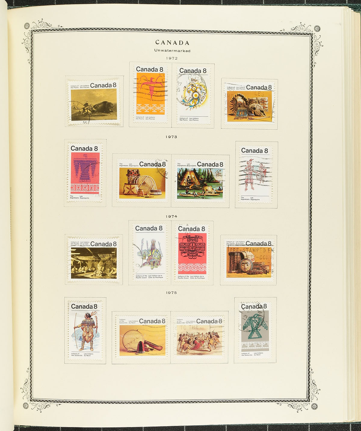 A classic Scott Specialty Series "Canada" album, with pages to 1978 including "back of the book" and Newfoundland. Partially filled with used, starting in the QV period and including better George V/VI and QEII. Of particular note is a complete used George V Admiral set, and QEII used coil pairs and booklet panes. An excellent book to be added to, with lots of spots that could easily be filled, bringing that old-time album back to life. Estimate =