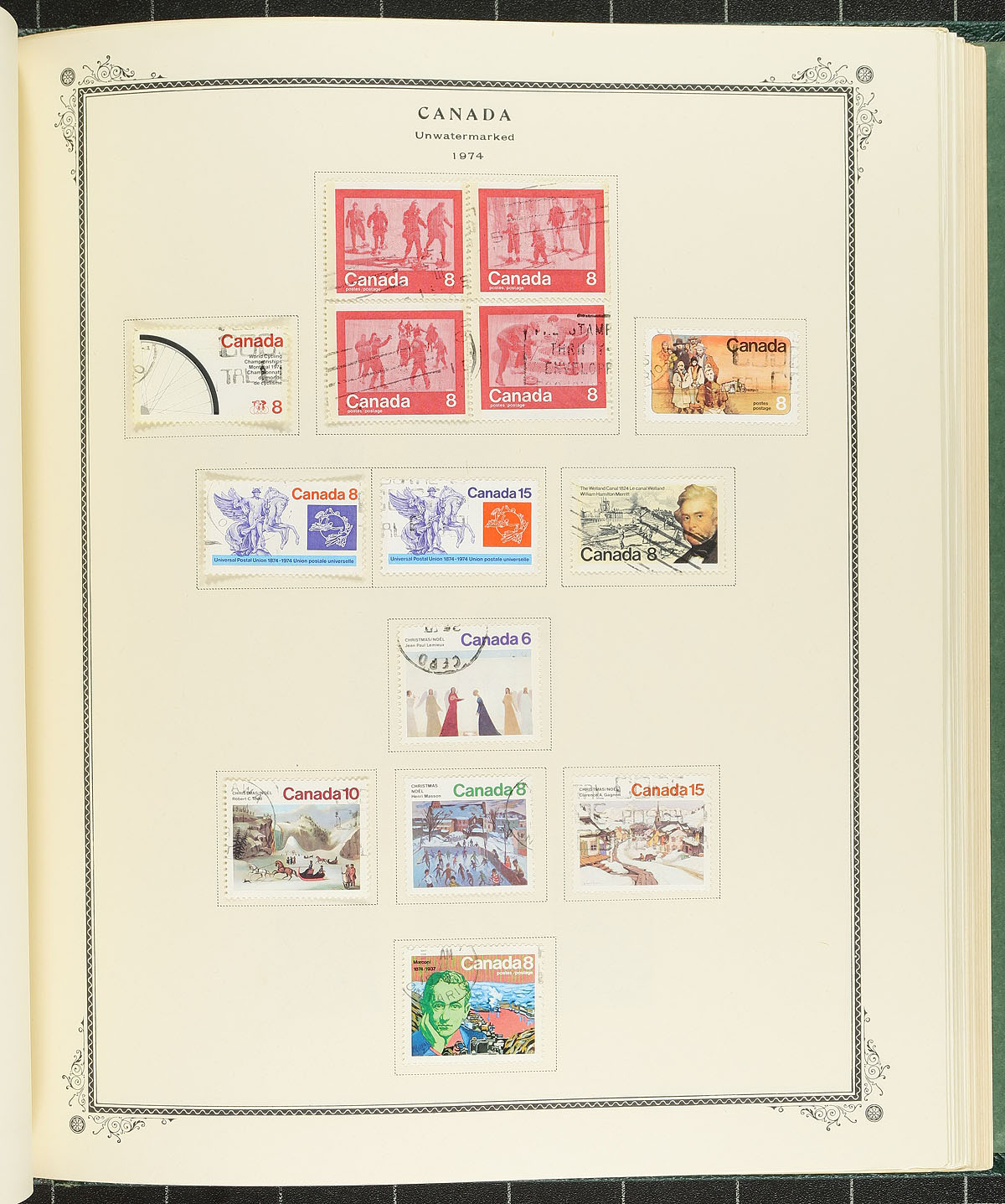 A classic Scott Specialty Series "Canada" album, with pages to 1978 including "back of the book" and Newfoundland. Partially filled with used, starting in the QV period and including better George V/VI and QEII. Of particular note is a complete used George V Admiral set, and QEII used coil pairs and booklet panes. An excellent book to be added to, with lots of spots that could easily be filled, bringing that old-time album back to life. Estimate =