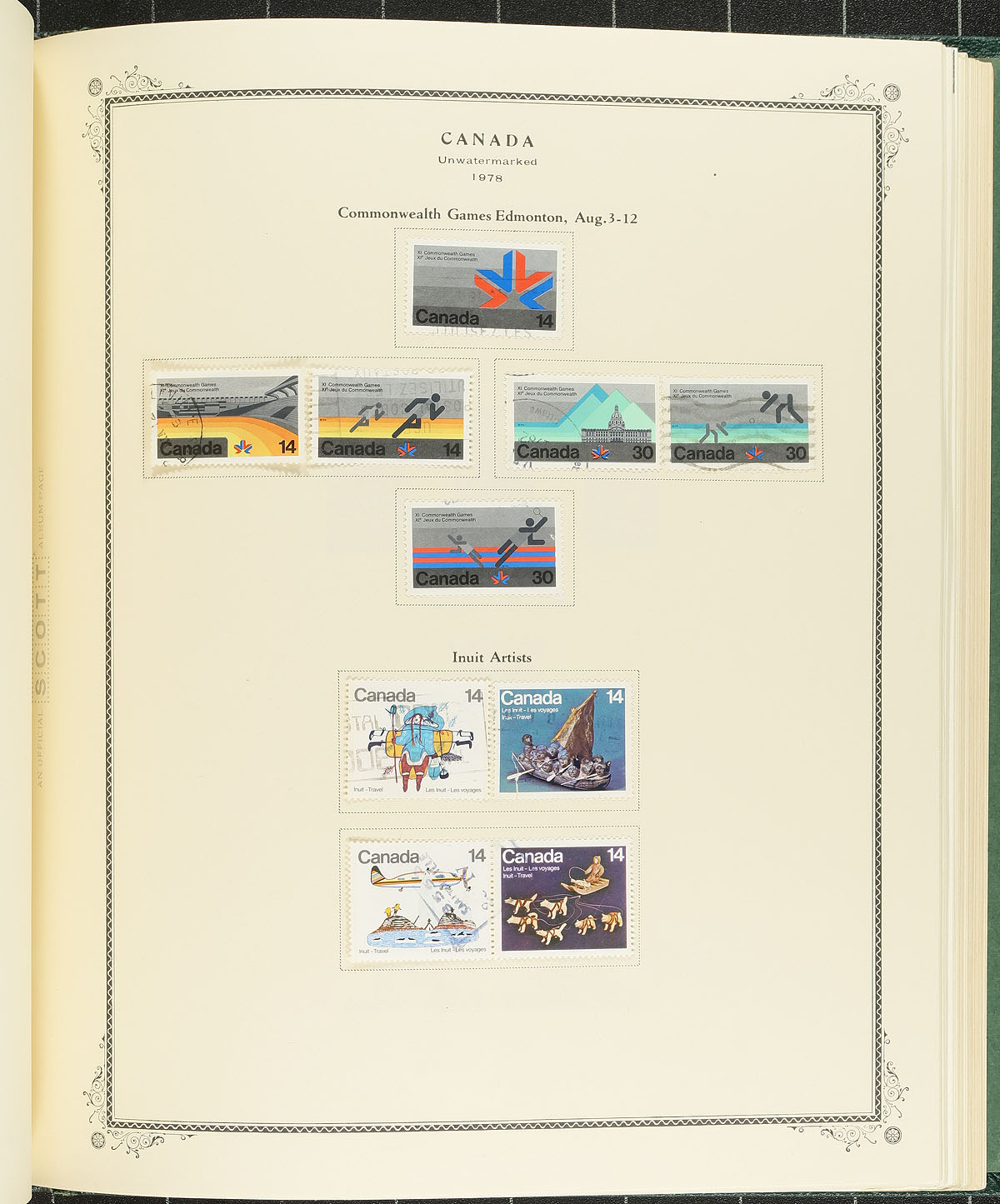 A classic Scott Specialty Series "Canada" album, with pages to 1978 including "back of the book" and Newfoundland. Partially filled with used, starting in the QV period and including better George V/VI and QEII. Of particular note is a complete used George V Admiral set, and QEII used coil pairs and booklet panes. An excellent book to be added to, with lots of spots that could easily be filled, bringing that old-time album back to life. Estimate =