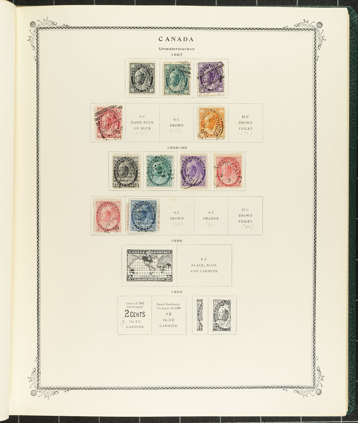 A classic Scott Specialty Series "Canada" album, with pages to 1978 including "back of the book" and Newfoundland. Partially filled with used, starting in the QV period and including better George V/VI and QEII. Of particular note is a complete used George V Admiral set, and QEII used coil pairs and booklet panes. An excellent book to be added to, with lots of spots that could easily be filled, bringing that old-time album back to life. Estimate =