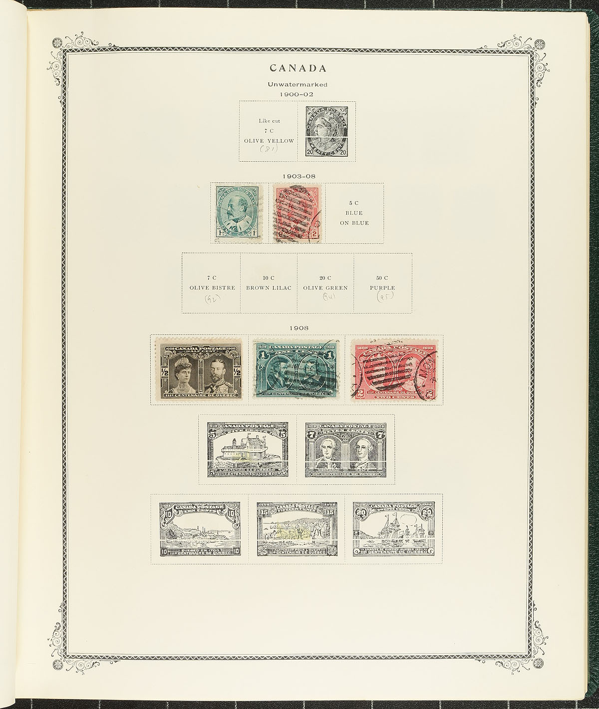 A classic Scott Specialty Series "Canada" album, with pages to 1978 including "back of the book" and Newfoundland. Partially filled with used, starting in the QV period and including better George V/VI and QEII. Of particular note is a complete used George V Admiral set, and QEII used coil pairs and booklet panes. An excellent book to be added to, with lots of spots that could easily be filled, bringing that old-time album back to life. Estimate =