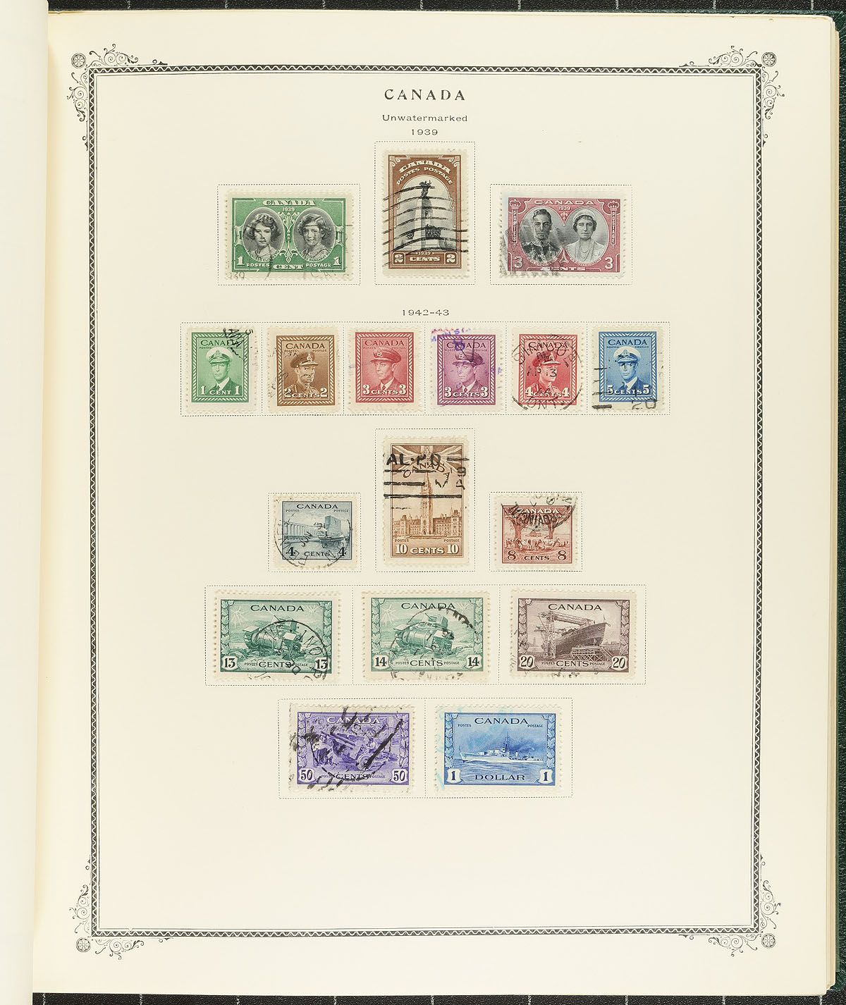 A classic Scott Specialty Series "Canada" album, with pages to 1978 including "back of the book" and Newfoundland. Partially filled with used, starting in the QV period and including better George V/VI and QEII. Of particular note is a complete used George V Admiral set, and QEII used coil pairs and booklet panes. An excellent book to be added to, with lots of spots that could easily be filled, bringing that old-time album back to life. Estimate =