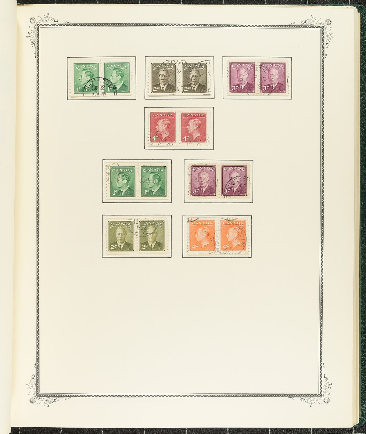 A classic Scott Specialty Series "Canada" album, with pages to 1978 including "back of the book" and Newfoundland. Partially filled with used, starting in the QV period and including better George V/VI and QEII. Of particular note is a complete used George V Admiral set, and QEII used coil pairs and booklet panes. An excellent book to be added to, with lots of spots that could easily be filled, bringing that old-time album back to life. Estimate =