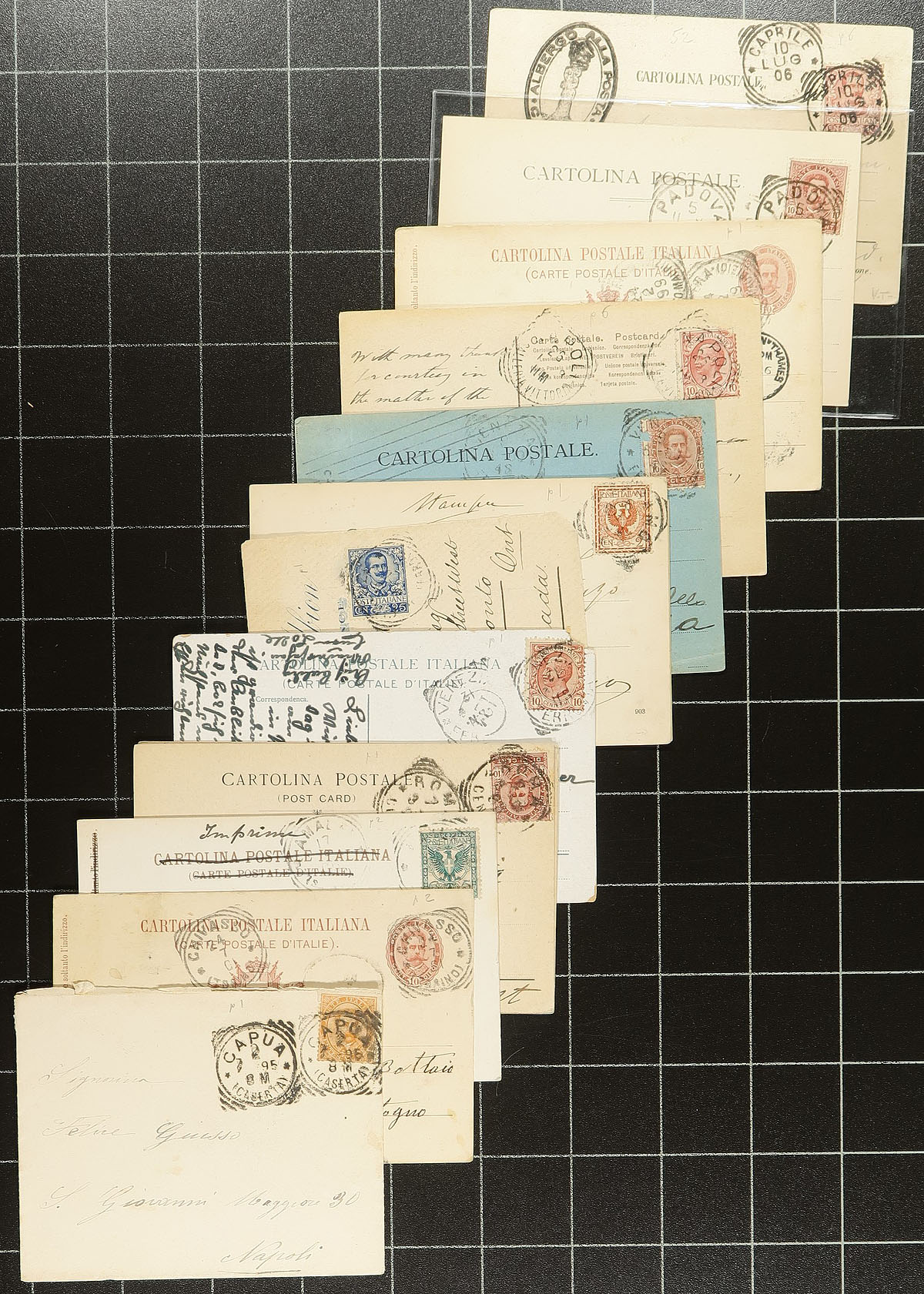 Italy Squared Circles. A lovely accumulation of 140 covers, documents and postcards, all with Squared Circle postmarks from 1890 to the early 1900's on King Umberto I and Vittorio Emanuele III issues. A huge variety of towns and regions (lots of small towns) with some being notated as either earliest or latest dates. Ex. Ted Kerzner collection. Estimate =