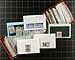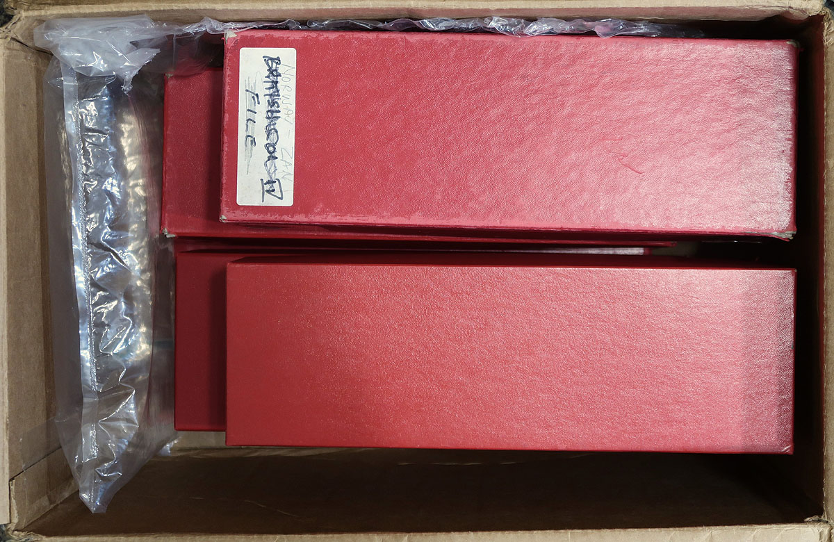 Stock in 6x Red Dealer Boxes - Afghanistan to Ireland. An enticing offering of 6 dealer "102" card boxes, five of which are full with "102" cards, with the sixth about 1/3 full of "102" cards and the rest of the box filled with oversize "104" cards with Finland and Hungary. Values up to $10.00 per card, with the owner estimated that the average value is $1.00 per card, but with there being about 4,000 cards in total! While the red boxes themselves are a bit battered, there is lots of value here for the collector or dealer. Estimate =