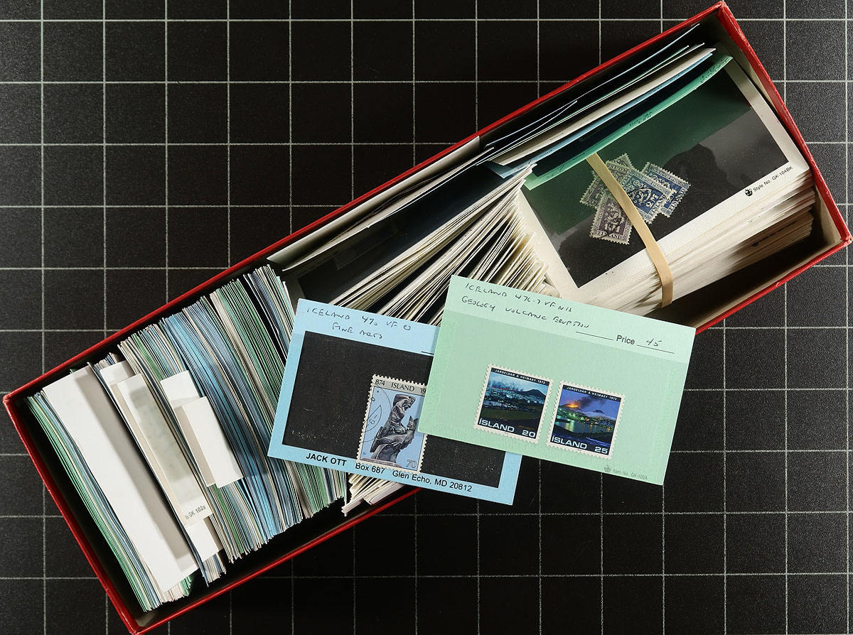 Stock in 6x Red Dealer Boxes - Afghanistan to Ireland. An enticing offering of 6 dealer "102" card boxes, five of which are full with "102" cards, with the sixth about 1/3 full of "102" cards and the rest of the box filled with oversize "104" cards with Finland and Hungary. Values up to $10.00 per card, with the owner estimated that the average value is $1.00 per card, but with there being about 4,000 cards in total! While the red boxes themselves are a bit battered, there is lots of value here for the collector or dealer. Estimate =