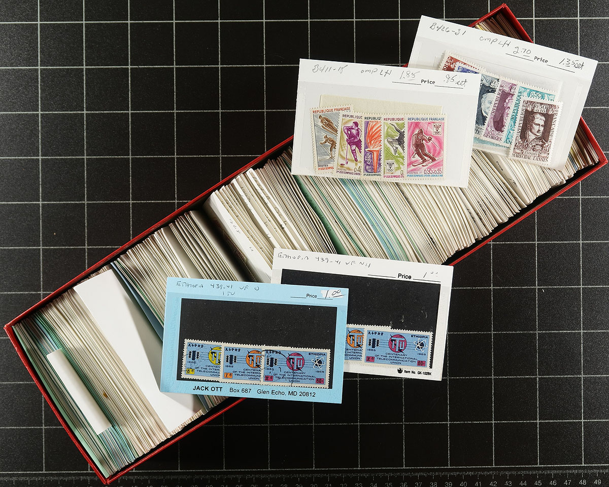 Stock in 6x Red Dealer Boxes - Afghanistan to Ireland. An enticing offering of 6 dealer "102" card boxes, five of which are full with "102" cards, with the sixth about 1/3 full of "102" cards and the rest of the box filled with oversize "104" cards with Finland and Hungary. Values up to $10.00 per card, with the owner estimated that the average value is $1.00 per card, but with there being about 4,000 cards in total! While the red boxes themselves are a bit battered, there is lots of value here for the collector or dealer. Estimate =
