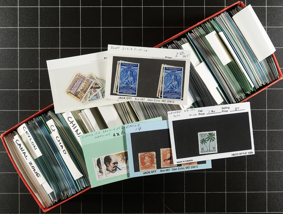 Stock in 6x Red Dealer Boxes - Afghanistan to Ireland. An enticing offering of 6 dealer "102" card boxes, five of which are full with "102" cards, with the sixth about 1/3 full of "102" cards and the rest of the box filled with oversize "104" cards with Finland and Hungary. Values up to $10.00 per card, with the owner estimated that the average value is $1.00 per card, but with there being about 4,000 cards in total! While the red boxes themselves are a bit battered, there is lots of value here for the collector or dealer. Estimate =