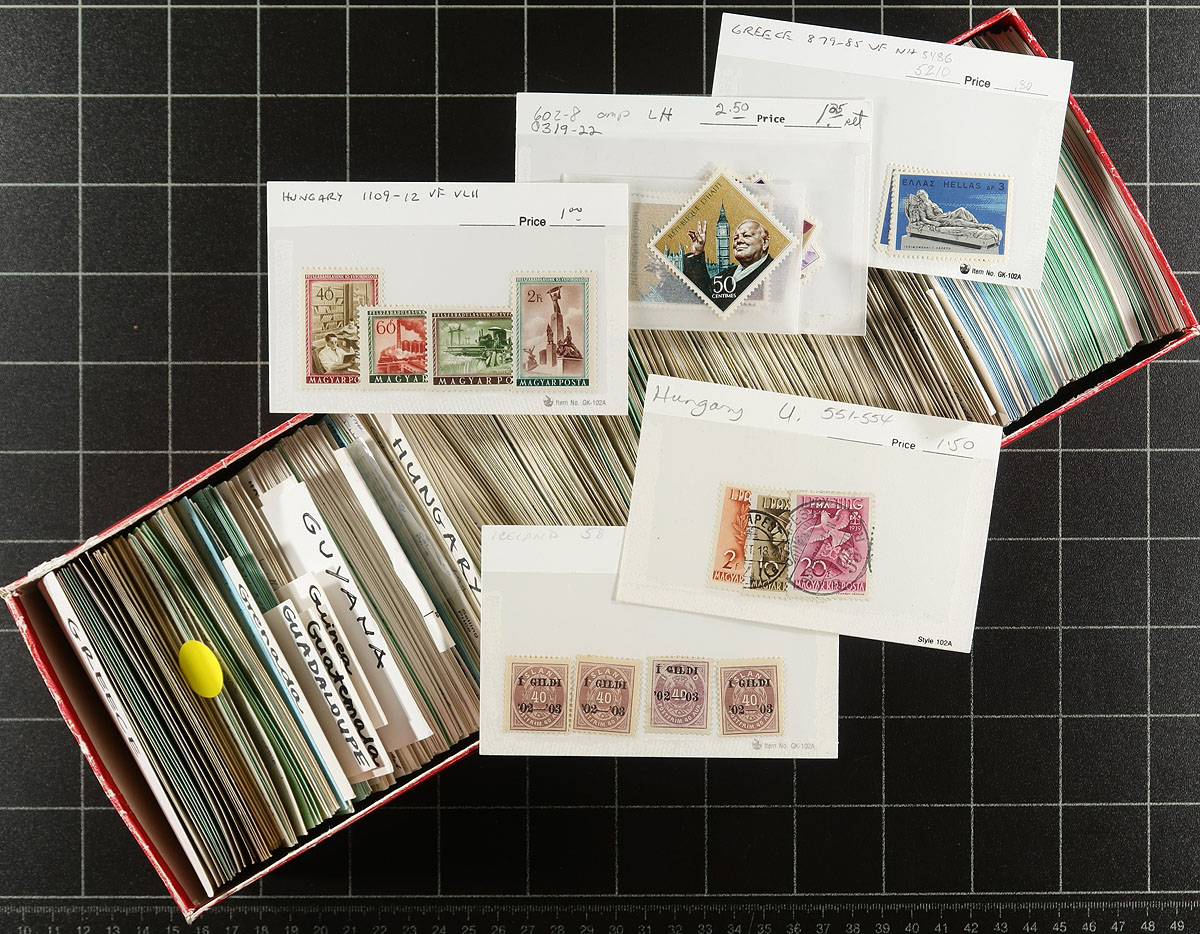 Stock in 6x Red Dealer Boxes - Afghanistan to Ireland. An enticing offering of 6 dealer "102" card boxes, five of which are full with "102" cards, with the sixth about 1/3 full of "102" cards and the rest of the box filled with oversize "104" cards with Finland and Hungary. Values up to $10.00 per card, with the owner estimated that the average value is $1.00 per card, but with there being about 4,000 cards in total! While the red boxes themselves are a bit battered, there is lots of value here for the collector or dealer. Estimate =