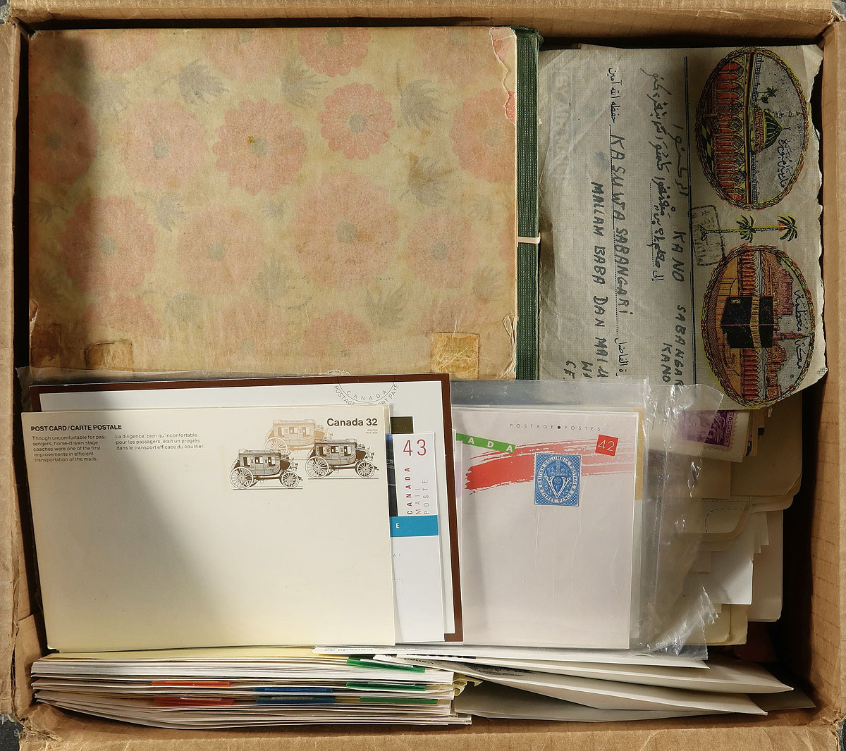 Small box stuffed with "hodge-podge" of material. There are stockpages, collection remainders, dealer selection pages, small stockbooks, a few random covers and envelops full of unsorted stamps by country. Noted remainder collections in folders of Nyassa and Netherlands Indies, loose classic Portugal and colonies on black vinyl stock pages and album pages, dealer selection pages with Romania, Russia and Chechnya (unissued), a stockbook labelled "Total Chaos" with classic Hungary in protective mounts (which lives up to the name and will require patient sorting) and moder Canadian postal stationery and aerogrammes (some unopened). Estimate =