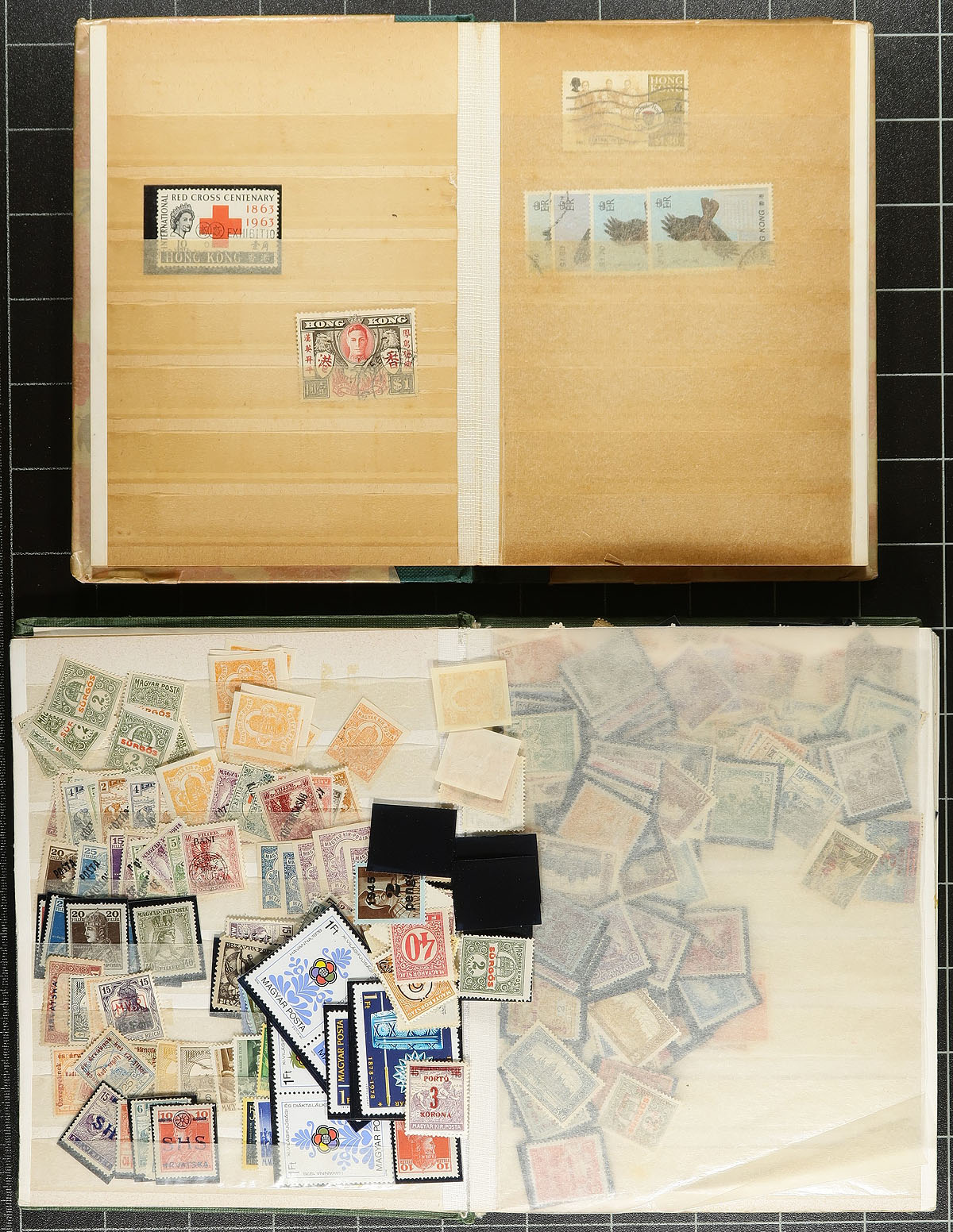 Small box stuffed with "hodge-podge" of material. There are stockpages, collection remainders, dealer selection pages, small stockbooks, a few random covers and envelops full of unsorted stamps by country. Noted remainder collections in folders of Nyassa and Netherlands Indies, loose classic Portugal and colonies on black vinyl stock pages and album pages, dealer selection pages with Romania, Russia and Chechnya (unissued), a stockbook labelled "Total Chaos" with classic Hungary in protective mounts (which lives up to the name and will require patient sorting) and moder Canadian postal stationery and aerogrammes (some unopened). Estimate =
