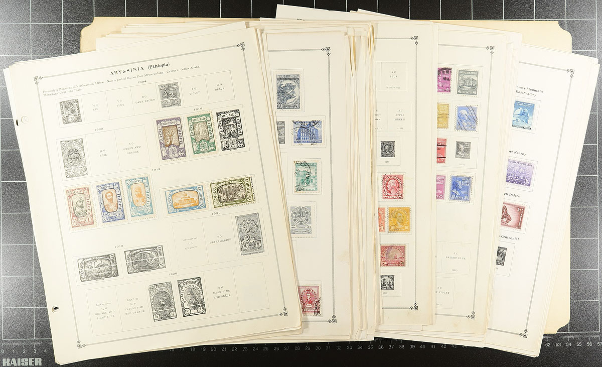 Small box stuffed with "hodge-podge" of material. There are stockpages, collection remainders, dealer selection pages, small stockbooks, a few random covers and envelops full of unsorted stamps by country. Noted remainder collections in folders of Nyassa and Netherlands Indies, loose classic Portugal and colonies on black vinyl stock pages and album pages, dealer selection pages with Romania, Russia and Chechnya (unissued), a stockbook labelled "Total Chaos" with classic Hungary in protective mounts (which lives up to the name and will require patient sorting) and moder Canadian postal stationery and aerogrammes (some unopened). Estimate =