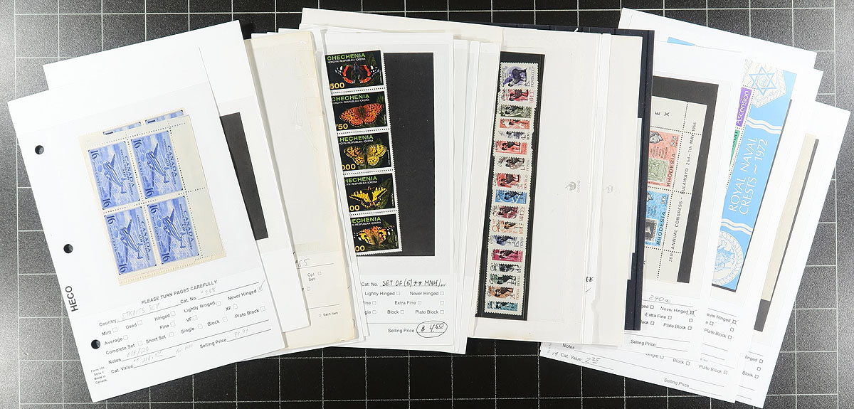 Small box stuffed with "hodge-podge" of material. There are stockpages, collection remainders, dealer selection pages, small stockbooks, a few random covers and envelops full of unsorted stamps by country. Noted remainder collections in folders of Nyassa and Netherlands Indies, loose classic Portugal and colonies on black vinyl stock pages and album pages, dealer selection pages with Romania, Russia and Chechnya (unissued), a stockbook labelled "Total Chaos" with classic Hungary in protective mounts (which lives up to the name and will require patient sorting) and moder Canadian postal stationery and aerogrammes (some unopened). Estimate =