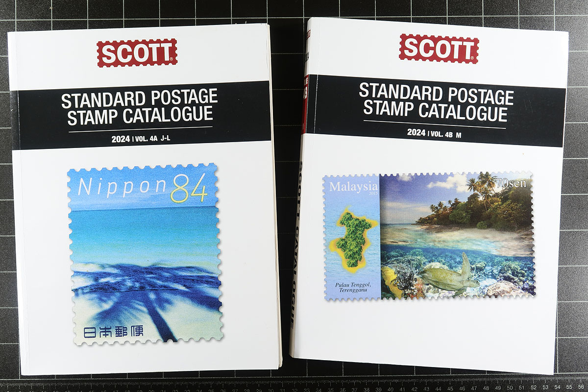 Complete set of 2024 Scott International stamp catalogues, all in lightly used condition. There have been few major price changes between 2024 and 2026 catalogues. As such, this set is still extremely useful for valuing most material and the numbers don't really change. New, these 12 volumes would retail for well over $1,200.00. The Scott catalogue numbering system is the most universally recognized stamp numbering system used today. Estimate =