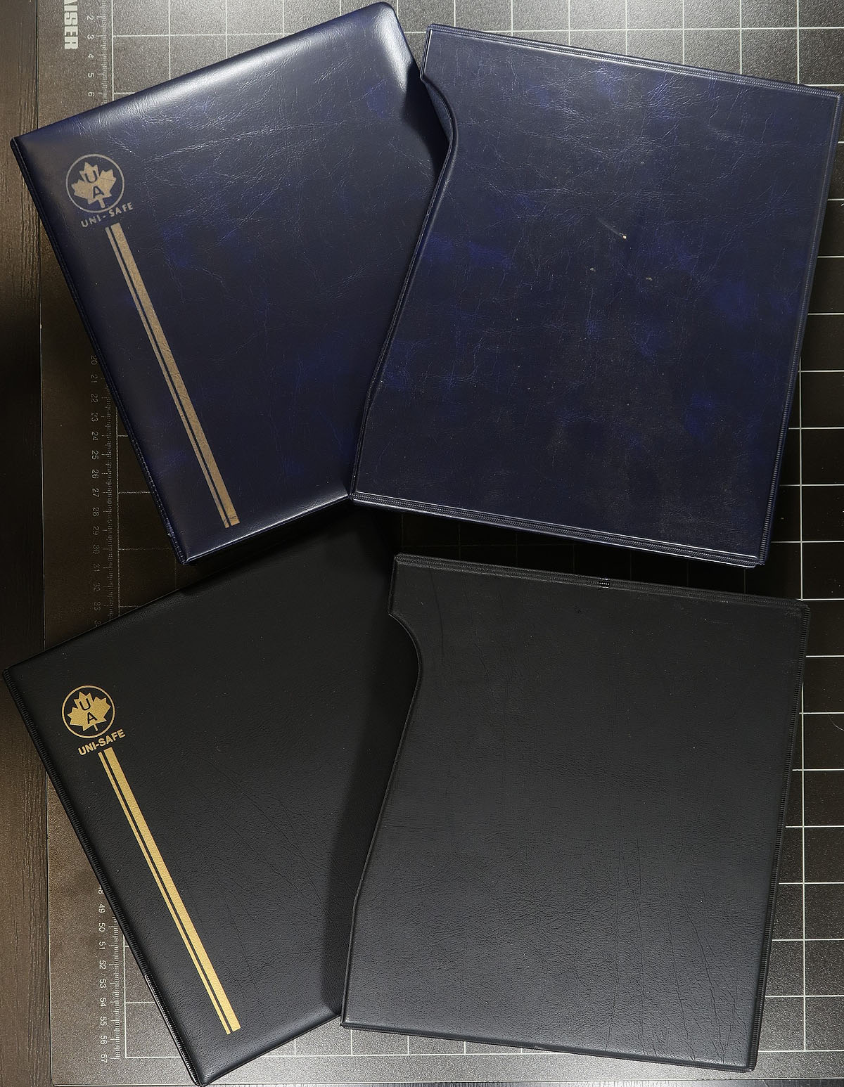 Postcard Albums. A useful offering of 6 Unisafe brand postcard albums, empty, in various colors with matching slipcases, plus 60 reasonably used clear pages to fit in these albums. Widely used among postcard collectors, extra pages as needed are available from several supply dealers. Estimate =