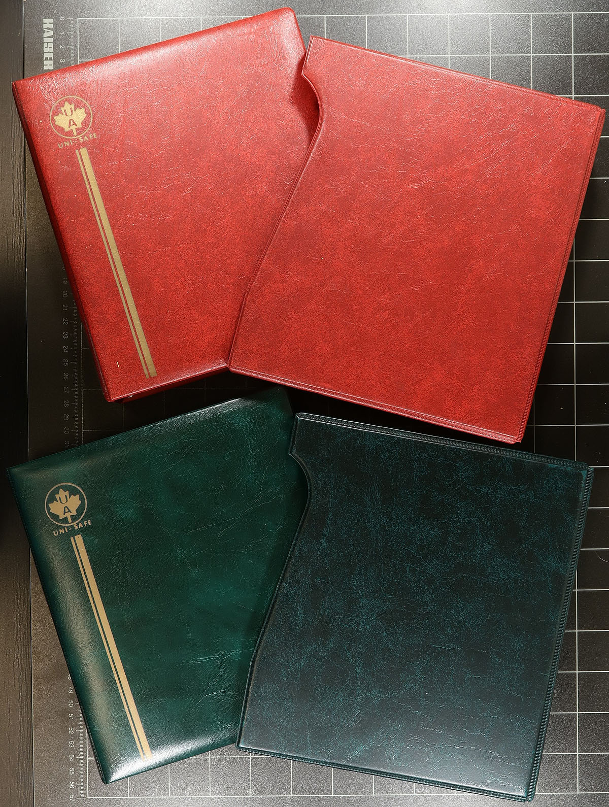 Postcard Albums. A useful offering of 6 Unisafe brand postcard albums, empty, in various colors with matching slipcases, plus 60 reasonably used clear pages to fit in these albums. Widely used among postcard collectors, extra pages as needed are available from several supply dealers. Estimate =